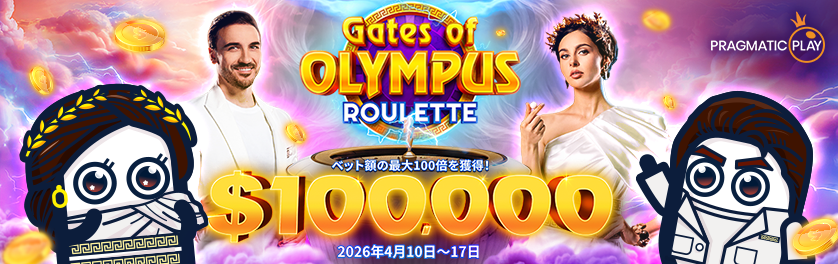 ①『Gates of Olympus Roulette Prize Drops』プロモーションは、2026年4月10日 2:00から2026年4月17日1:59(日本時間)まで、賞品総数は15,050本、$101,500相当の賞品の賞品を用意しております。