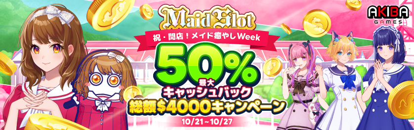 期間中に「MaidSlot」をプレイして損失が出てしまったプレイヤー様の中から、抽選で50名様に最大$100をキャッシュバックします。