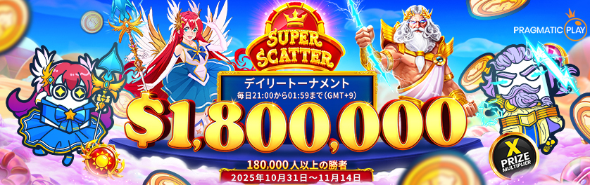 Pragmatic Play主催の『Super Scatter Series デイリートーナメント』は、賞金総額$1,800,000相当を用意し、超大型トーナメント!
